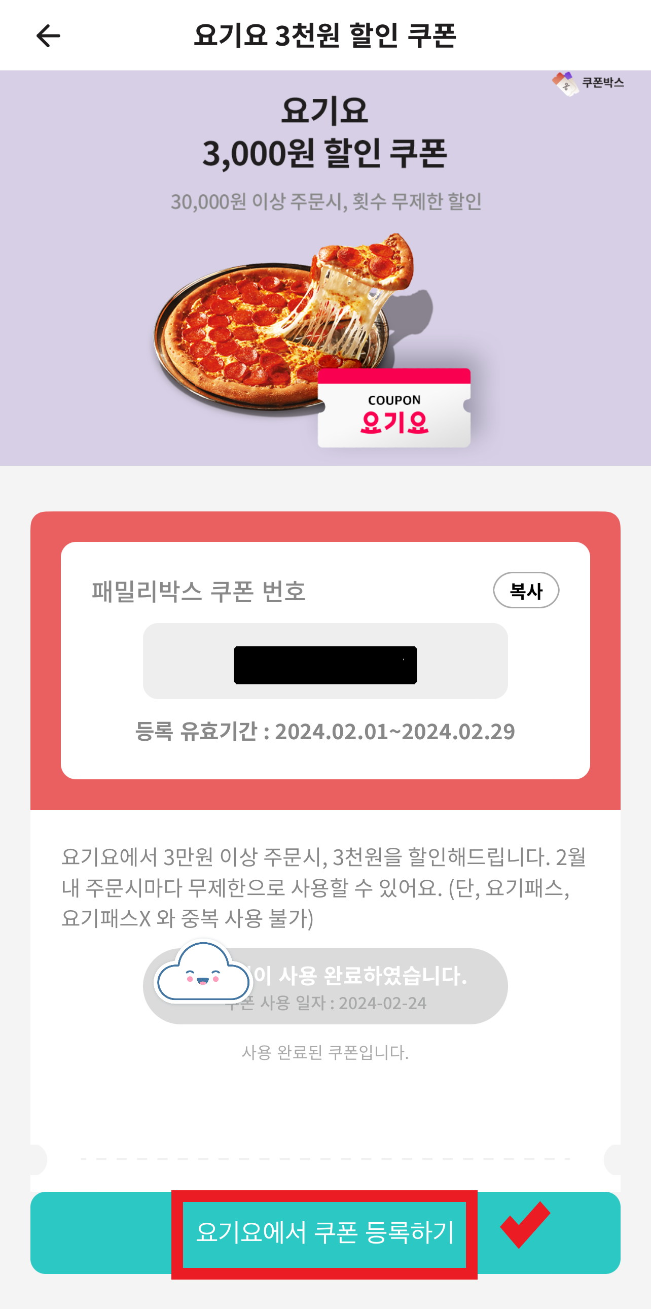 · 혜택안내: 요기요 앱 설치 후 로그인(본인인증 계정) > 마이 요기요 쿠폰함 선택 > 쿠폰번호 입력 후 등록 > 주문 시 쿠폰 적용 및 잔여금액 결제